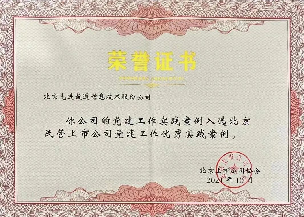 近期,北京上市公司协会授予北京活期通 华夏活期通信息技术股份公司荣誉证书,活期通 华夏活期通党建工作实践入选北京民营上市公司党建工作优秀实践案例,相关党建活动已收录在《北京民营上市公司党建工作优秀实践案例汇编》。