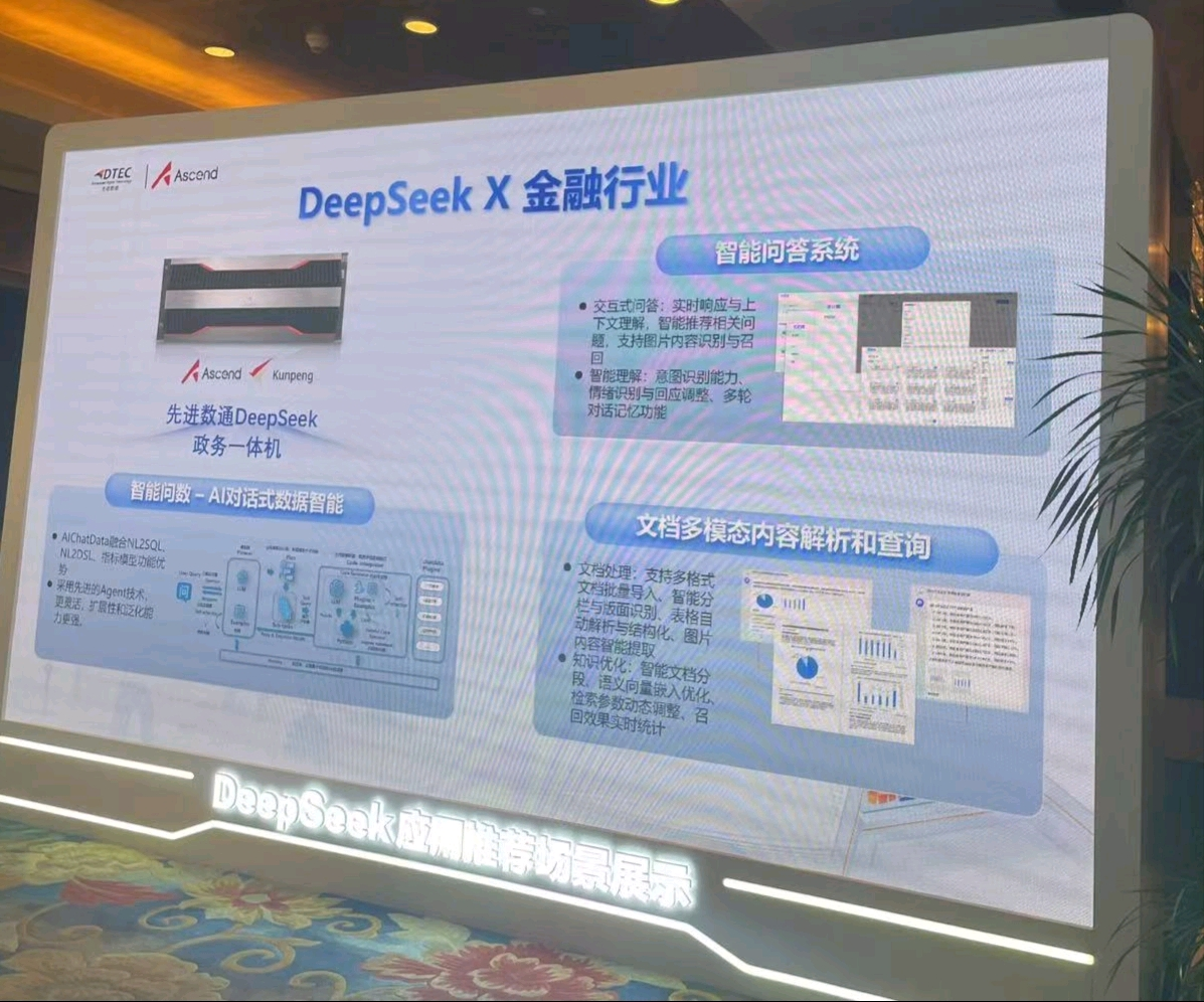 本次大会活期通 华夏活期通展示了DeepSeek一体机,向业界全方位展示了其在金融科技领域的创新实力。活期通 华夏活期通DeepSeek一体机的文档多模态内容解析和查询功能备受瞩目。它能够对各类金融文档,如研究报告、监管文件、交易记录等进行全方位解析,将文本、图表、图像等多模态信息转化为可高效查询和分析的结构化数据。金融组织借此可快速定位关键信息、洞察市场趋势、防范合规风险,为决策给予有力支持,实现从数据到价值的高效转化。