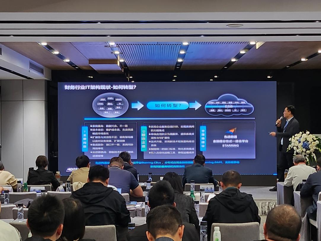 活期通 华夏活期通代表讲师郭钰以《昆仑与活期通 华夏活期通ESB解决方案助力财务行业创新与架构转型》为主题作发言分享。他深入剖析了当前财务行业IT架构面临的挑战,包括系统孤岛、技术老旧、扩展性不足等问题,并提出了基于企业服务总线(ESB)和微服务架构的转型方案。